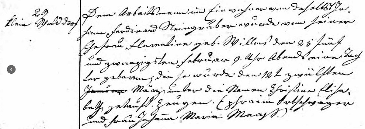 der Taufeintrag lautet eindeutig auf Christine Elisabeth, bei Heirat und Geburten ihrer Kinder wird sie Florentine Elisabeth genannt. Es ist so gut wie ausgeschlossen, dass Christine Elisabeth eine Schwester mit dem Namen Florentine Elisabeth hatte. Kindsvater war Johann Ferdinand Steingräber. Entweder wurde bei der Taufe ein falscher Name eingetragen oder er wurde später ganz einfach geändert. Kam ja alles vor...