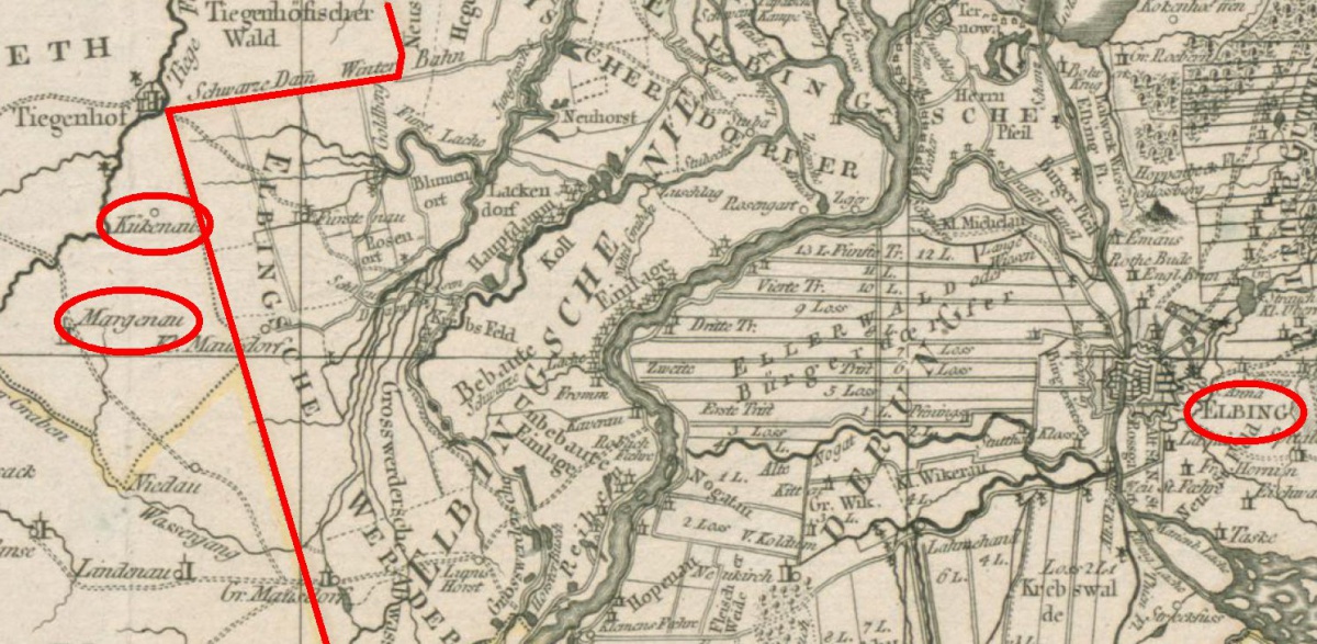 Die Braut wird wohl aus dem 'Elbingschen' stammen - vermutlich eher aus dem westlich davon gelegenen Gebiet. Das wird wohl eher 'nahe Tiegenhof zu suchen sein. Zur besseren Orientierung hier eine Karte mit dem von mir nachgezeichneten Grenzverlauf zwischen den zu Marienburg und Elbing gehörigen Gebieten. Unter 'Kükenau' ist übrigens 'Rickenau' bzw. 'Rückenau' zu verstehen.