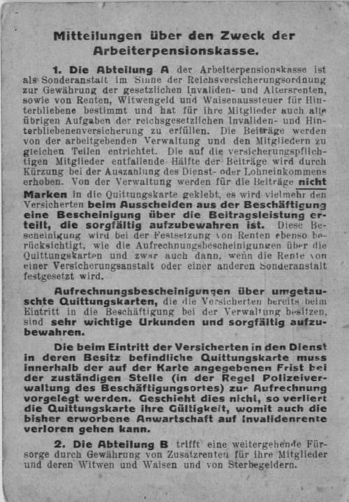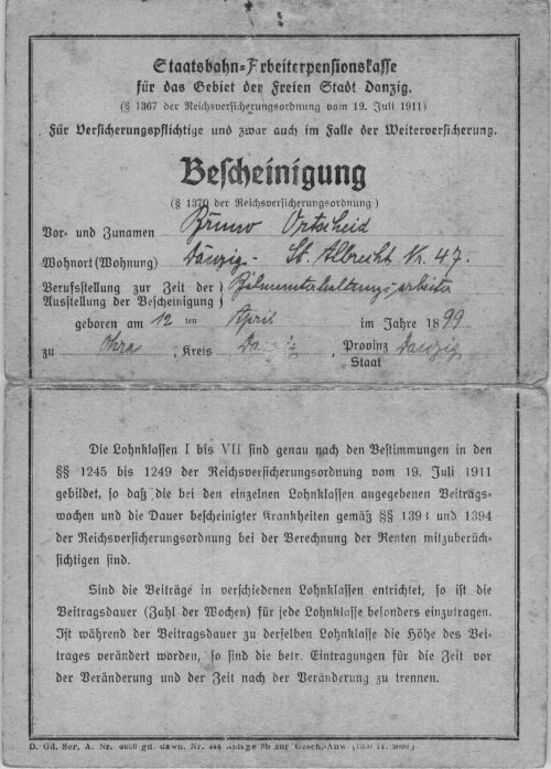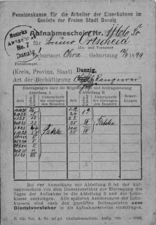Beigefügt seht Ihr zwei eingescannte Dokumente der Staatsbahn-Arbeiterpensionskasse Danzig. Das erste Dokument ist eine Beitragsbescheinigung für den in Ohra geborenen Bahnunterhaltungsarbeiter Bruno Ortscheid von St.Albrecht 47. Das zweite Dokument ist ein Aufnahmeschein für die Pensionskasse.