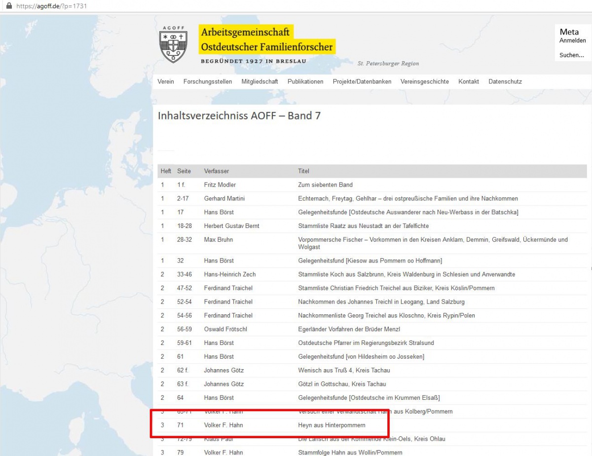 im Archiv ostdeutscher Familienforscher (AOFF) - Band 7 - 3 findet sich ab Seite 71 der Artikel 'Heyn aus Hinterpommern'. Darin wird die familiäre Vorgeschichte des Danziger Reeders Friedrich HEYN abgehandelt.