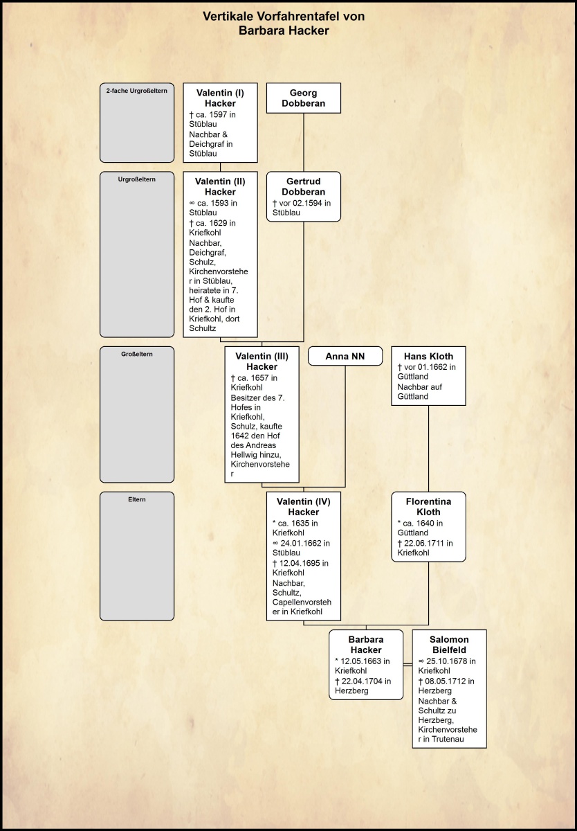 vielen Dank für Deine Abbildung in #6. Die Ergebnisse von Dorothea Weichbrodt schaue ich mir genau an. Bislang war mir nur Valentin Hacker IV, Florentina Kloth und Hans Kloth bekannt. Bei diesen Personen handelt es sich mit großer Wahrscheinlichkeit um meine Vorfahren.