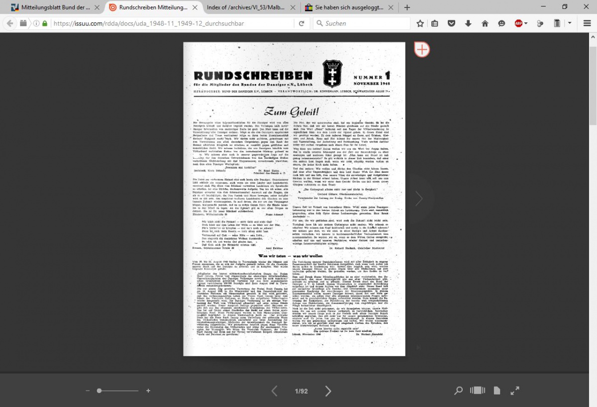 kann mir jemand bitte helfen, wie ich die u.a. verlinkte Seite "Mitteilungsblatt Bund der Danziger 1948 und 1949" einigermaßen gut lesen kann? Für meine Augen ist die dort gezeigte Schriftgröße leider zu klein, und sie lässt sich mit meinem PC auch nicht durch Strg+ für mich lesbar vergrößern.