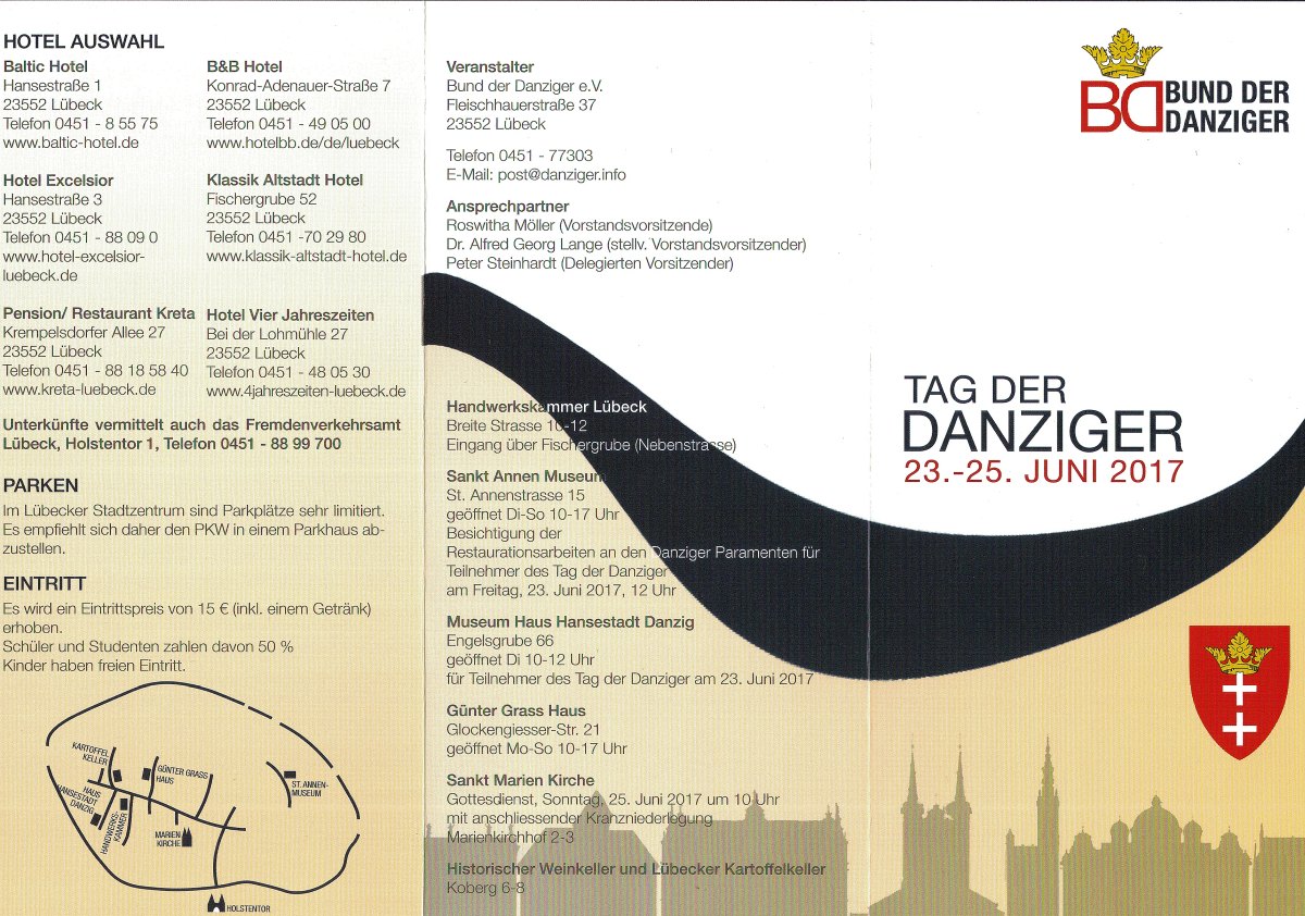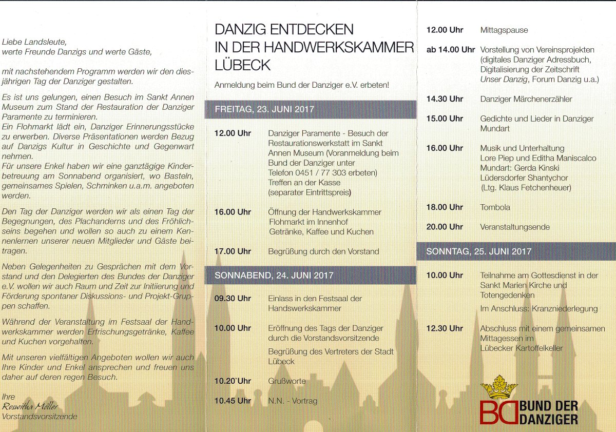 Der Tag der Danziger findet 2017 in Lübeck vom Freitag, 23. Juni und Sonnabend, 24. Juni in Lübeck statt. Am Freitag ist ein Empfang in der Handwerkskammer um 16.00 Uhr vorgesehen. Die Veranstaltung wird fortgesetzt am Sonnabend um 10.00 Uhr im Grossen Sitzungssaal der Handwerkskammer.