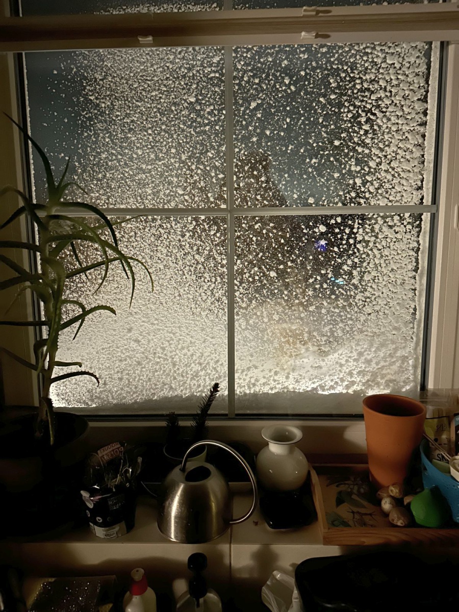 Gestern Nacht blies der Sturm aus nördlichen Richtungen. Trotzdem war das Haus rundum schneebedeckt, auch auf allen Fenstern blieb der Schnee haften. Hier ein Blick aus unserem Küchenfenster: