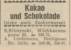 von der Schokoladen-, Marzipan-, und Zuckerwarenfabrik A.LINDEMANN, Inh.: Joh. Rhode, Danzig, Sandgrube 20-20a, berichtet.