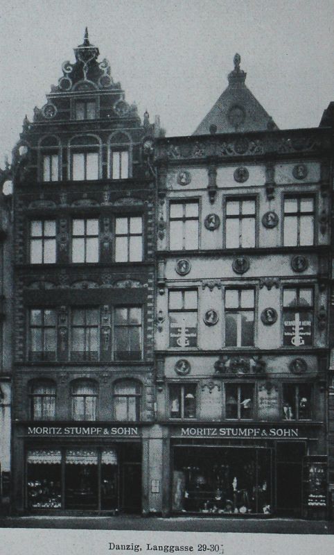 Die Firma Moritz Stumpf & Sohn wurde im Jahre 1804 von Carl Stumpf begründet. Sie gehört zu den ältesten Danziger Unternehmungen und ist die einzige, die über ein Jahrhundert durch vier Generationen in einer Familie geblieben ist. Aus den kleinsten Anfängen hat sich das Haus Stumpf im Laufe der Jahre zu der Höhe entwickelt, die es seit Jahrzehnten im Danziger Wirtschaftsleben einnimmt. Zahlreiche Silbergeräte und prächtige Schmuckstücke im öffentlichen und privaten Besitz geben beredtes Zeugnis von seiner Leistungsfähigkeit zu allen Zeiten. Einen ganz besonderen Aufschwung nahm die Firma seit der Verlegung ihres Hauptbetriebes im Jahre 1900 nach der Langgasse, der Hauptgeschäftsstraße Danzigs. Durch vielfache Vergrößerungen der Ausstellungsräume und Umbauten der Häuser, besonders durch die Angliederung eines großzügig geleiteten Kunstgewerbehauses im Jahre 1907 wurde das Unternehmen zu seiner heutigen Gestalt erweitert. In den letzten Jahren wurde eine neuzeitlich eingerichtete Fabrik und zahlreiche Kontore geschaffen, die für den modernen Großbetrieb und den Bestand von über 80 Angestellten notwendig waren. Im benachbarten Seebade Zoppot und im Vorort Langfuhr wurden die Filialen durch den Ausbau der in günstigster Lage befindlichen eigenen Grundstücke zu erstklassigen Juwelier- und Kunstgewerbegeschäften ausgestaltet. Weit über Deutschlands Grenzen reichte vor dem Kriege das Absatzgebiet der Firma, die sich durch ihre neuartigen und künstlerischen Bernsteinerzeugnisse Weltruf verschafft hatte. Zahlreiche Bestellungen wurden für das deutsche und russische Kaiserhaus und viele andere Fürstenhöfe ausgeführt. Auf allen beschickten Ausstellungen wurden die hochwertigen Erzeugnisse des Hauses mit den ersten Preisen bedacht und sie konnten sich sogar auf der Weltausstellung in Turin 1911 den „Grand Prix" und die „Große Goldene Medaille“, in Malmö 1914 die „Goldene Staatsmedaille“ sichern. Die Abtrennung Danzigs vom Deutschen Reich und die hierdurch geschaffene völlig veränderte Wirtschaftslage bedingte für die alte Danziger Firma eine vollständige Umwandlung und die Eroberung neuer Absatzgebiete, um sich ihre führende Stellung auch für die Zukunft zu sichern.