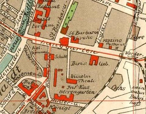 ich habe auf einem alten Stadtplan von 1912 die exakte Lage des Wilhelmtheater gefunden. Auf der Höhe des Kirchturms von St.Barbara ging auf der anderen Seite von Langgarten rechtwinklig ein schmaler Weg ab der zum Theater führte. Als Anlage füge ich einen Kartenausschnitt bei.
