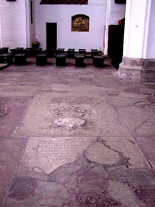 Die Danziger Patrizier schmückten ihre Kirche nicht nur, sondern wählten sie auch — seit dem 15. Jahrhundert — zur Ruhestätte für die verdienstvollsten Bürger aus. Daher haben wir auf dem Steinboden eine Übersicht der Namen, Wappen und Zeichen aller bedeutenden Danziger Familien. Der Reichtum der einzelnen Stifter bestimmte das künstlerische Niveau der Platten, von denen die meisten von hiesigen Steinmetzen und Gießern gearbeitet wurden.