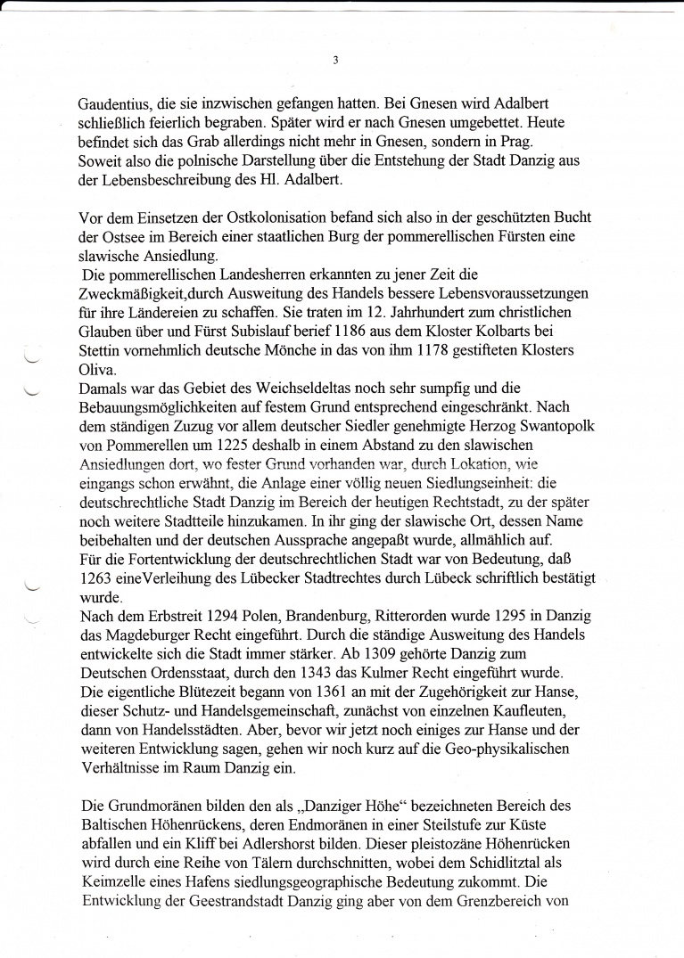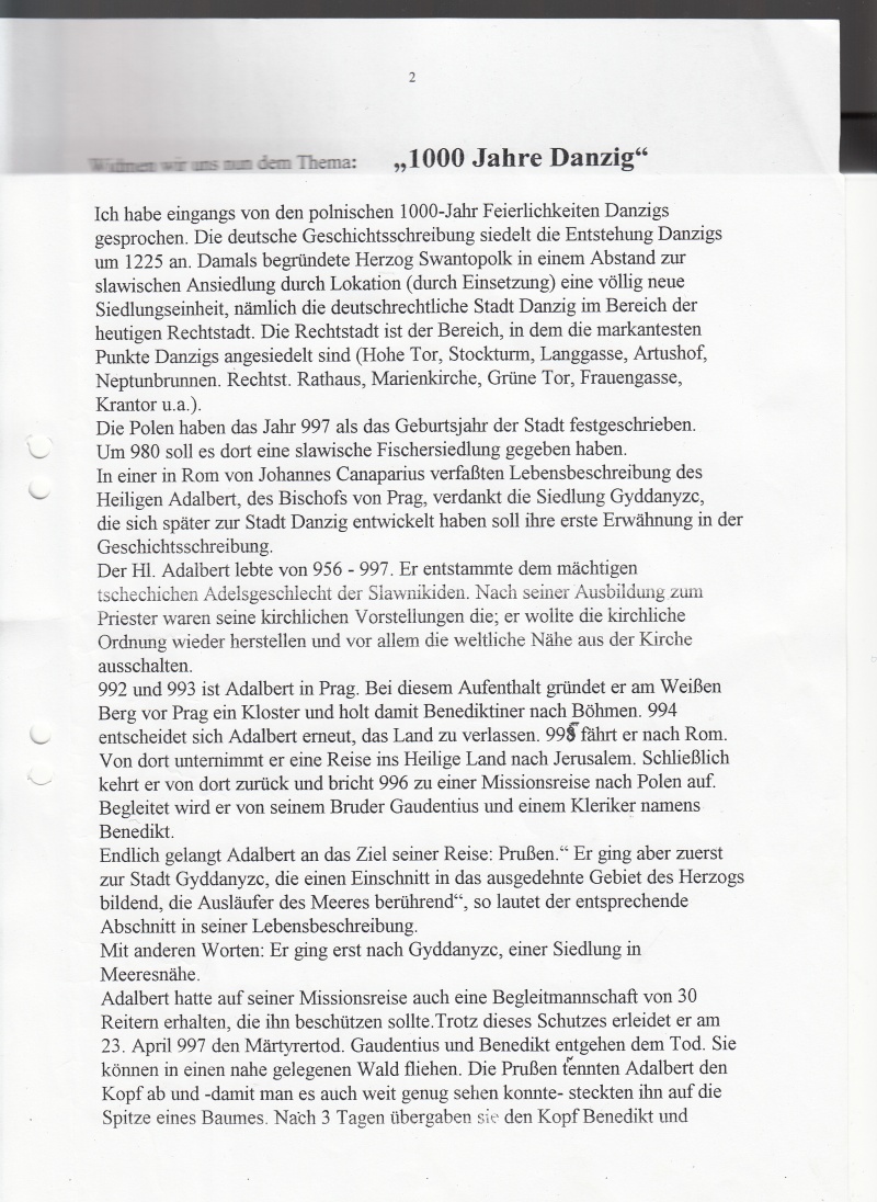 Nach einer Biographie, verfasst vom Römer Casparius, soll Adalbert auf seiner Missionsreise (997) „zuerst die Stadt Gyddanyzc“ besucht haben. Aus diesem Namen „Gyddanyzc“ entwickelten sich später so viele andere Namen, Gdantzk, Dantzk, Gidanic, Danzig, Gedanum. Letzteres hatten wir a.a.O. diskutiert.