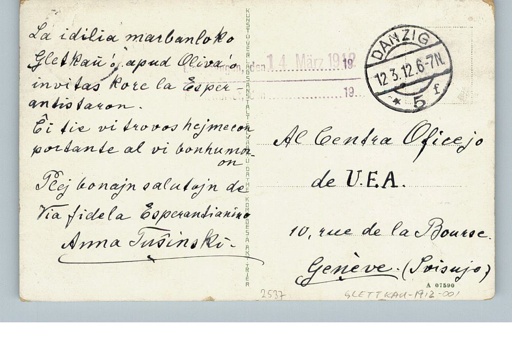 Die Ansichtskarte wurde in Esperanto beschrieben und am 13.03.1912 nach Genf geschickt. Kann jemand von Euch Esperanto?