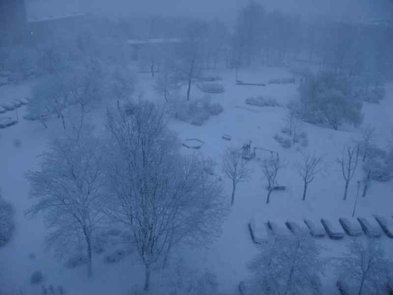 als wir heute Morgen um 6:00 Uhr aufstanden, dachten wir zuerst, es sei furchtbar neblig. Draussen war gerade mal eine Handbreit zu sehen. Aber es war nicht Nebel, es war starker, dichter Schneefall.