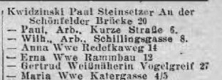 So hier nun als Antwort auf Deine priv. Nachricht die Angaben zu “ Kwidzinski” aus den Einwohnerbüchern 1937/38 und 1942.