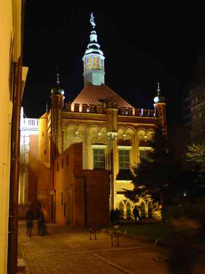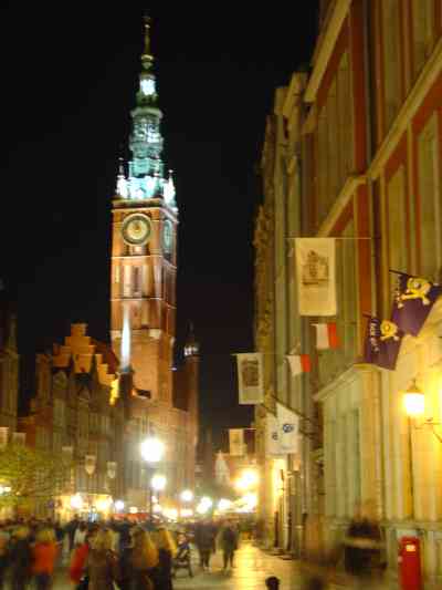 Draußen ist es doch recht frisch geworden. Kinga und ich waren bis vor Kurzem auf dem Kohlenmarkt gewesen, hatten zwei Sängern, Anita Lipnicka und John Porter zugehört. Zur "Kaffeemühle" hin, dem Theater, war eine riesige überdachte Tribüne aufgebaut worden, auf dem sie und die begleitenden Musiker den Versuch unternahmen, ein bisschen Stimmung zu schaffen. Vor der Tribüne war die Mitte des Kohlenmarktes - etwa die Hälfte des Areals - von Absperrgittern umgeben. Außerhalb des Gitters standen dicht gedrängte Menschenmassen, während es innerhalb der Gitter trotz hervorragenden Blickes auf die Musiker sehr ruhig zuging. Ich strebte auf einen Eingang zu, der von etlichen Wachleuten abgeschirmt war. Nach Kontrolle meines kleinen Rucksackes in dem sich eine Flasche Champagner und zwei Plastikbecher befanden, wurden wir durchgelassen. Wir stellten uns hin, hörten zu. Die Sänger trugen melancholisch wirkende Lieder vor, Lieder, die ein wenig an Leonard Cohen erinnerten. Stimmung wollte nicht aufkommen. Ein Lied nach dem anderen wurde abgespult, bei manchen gab es ein wenig Applaus. Ich schaute mich um, sah dass jenseits der Absperrgitter, die meisten Zuhörer etwas zu trinken hatten. Junge Mädchen, Bierdosen in der Hand, lachend, junge Männer, ebenfalls mit Bierdosen bewaffnet, angeheitert, aber friedlich. Aber innerhalb des Gitters waren Getränke nicht erlaubt. Deswegen also auch die Kontrollen. Die meisten Besucher standen still da und schauten oder hörten zu. Sie wirkten neugierig, fast so, als warteten sie darauf, dass es endlich los geht, dass endlich ein bisschen Stimmung einkehrt. Wir schauten uns um, beobachteten die Leute. Jener Mann dort, der mit dem langen silbergrauen zu einem Zopf zusammen gebundenen Haar, der mit der Jeansjacke, ist er älter oder jünger als ich? Kinga meinte, er sei ganz sicherlich älter während ich mit den Schultern zuckte und es für möglich hielt, dass er die 50 noch nicht erreicht habe. Die Rückseite des Zeughauses, die St.Georgs-Halle und der Stockturm waren angestrahlt, verschafften optisch ein wenig von der Atmosphäre, die sich akustisch nicht so recht entstellen wollte. Wir vertraten uns die Füße, liefen ein wenig herum. Um 22 Uhr hörten die Musiker auf. Und nun kam auch noch etwas Beifall auf. Kinga sagte mir, die Beiden seien zuvor immer nur in Hallen aufgetreten. Dies sei ihr erstes Open Air-Konzert. Nun ja, aber ein bisschen mehr „Dampf“, ein bisschen mehr Schwung hätte doch sein können! Ich fand es zwar nicht unbedingt langweilig, und eingeschlafen ist auch niemand, aber anlässlich des bevorstehenden Beitritts Polens zur EU wäre möglicherweise eine andere, eine flottere Musik angebrachter gewesen. Ein Sprecher ging auf die Tribüne, rief in die Menge und Kinga übersetzte: "Wer von den Herrschaften hat eine Europafahne? Bitte hierher hochkommen!" Niemand kam. "Die Herrschaften mit eine Europafahne, bitte die Fahne schwenken". Hälse streckten sich, Köpfe wurden gedreht, aber keine Fahne wurde geschwenkt. "Kinga" fragte ich, "siehst Du hier irgendwo eine Europafahne?" Wir schauten uns um, sahen nirgendwo eine Fahne, weder an einem Gebäude noch an einem Mast noch von irgend jemandem geschwenkt. Ich hatte genug. Wollte zum Neptunbrunnen um ein schönes Nachtfoto zu schießen. Uns durch Menschenmassen hindurch drängelnd liefen wir durchs Goldene Tor, hatten die Langgasse vor uns und ein wunderschönes Bild von dem in Licht getauchten Rathausturm. Und hier, in der oberen Langgasse, befand sich auch das Cafe, in dem wir uns ein bisschen aufwärmen und ausruhen wollten.