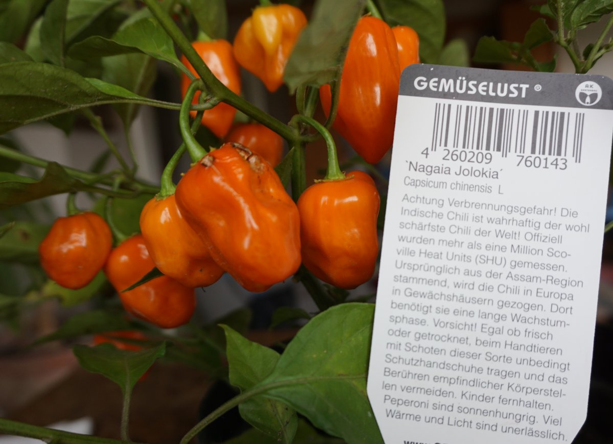 Chili ist kein einheimisches Gewächs. Das brauche ich nicht extra zu betonen, aber trotzdem war ich ein bisschen überrascht wie hervorragend sie sich hier entwickelten. Und diese Chilis sind etwas ganz Besonderes: Sie gehören zu den schärfsten Chiligewächsen die es überhaupt gibt. Mit über 1.000.000 Scoville (das ist die Messeinheit für den Schärfegrad) weckt die "Nagaia Jolokia" die Lebensgeister. Zum Vergleich: Tabasco hat "milde" 2.500 Scoville.