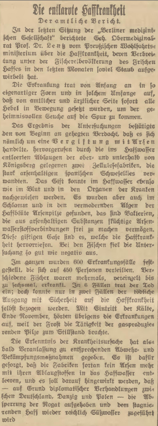 in unserem Landkreis Nowodworski (Tiegenhof) ist eine Krankheit aufgetreten, die mehrfach in den 20er und 30er Jahren des letzten Jahrhunderts zu zahlreichen teils sehr schweren Krankheitsfällen führte. Es ist die sogenannte "Haff-Krankheit" die überwiegend Haff-Fischer befiel und deren Ursachen nie abschließend erforscht wurden. Man vermutete, dass evtl. Schadstoffeinleitungen ins Haff (Arsen und Quecksilber) ursächlich für die Vergiftungserscheinungen gewesen sein könnten.