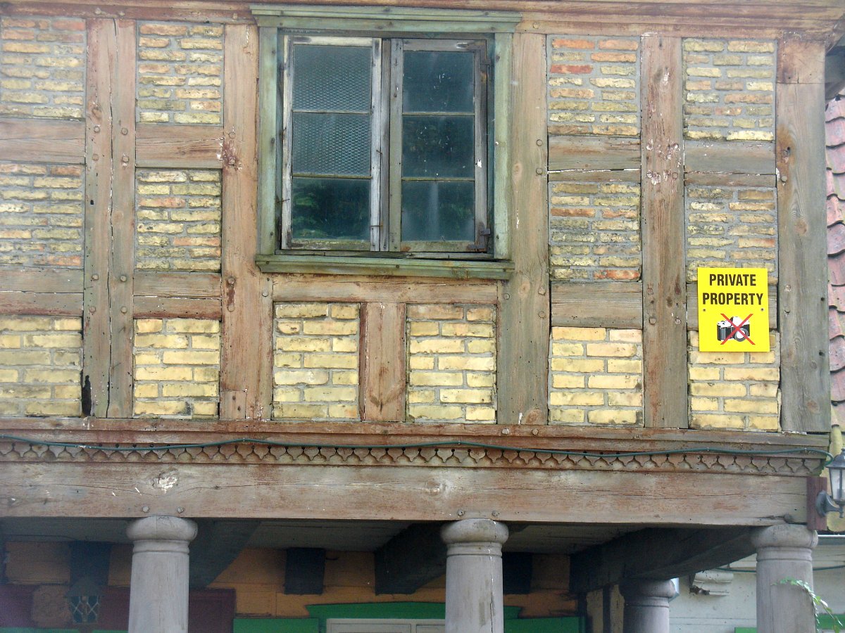 Aber -und das sah ich bisher hier noch nirgendwo- der zunehmend schlechter werdende Zustand soll fotografisch nicht mehr dokumentiert bzw. das Fotografieren des direkt an einer öffentlichen Straße liegenden denkmalsgeschützten Gebäudes soll unterbunden werden. Der Eigentümer -ein Scherzkeks?- hat nun zwei große das Haus noch mehr verschandelnde Tafeln links und rechts auf die Vorlaubenfassade draufgenagelt, mit der er offensichtlich ein Fotografieverbot ausspricht!
