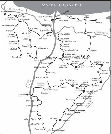 Die interessanteste Personenfahrstrecke war wohl diejenige von Stutthof über Steegen nach. Nickelswalde. Sie führte immer am Waldrand entlang und war landschaftlich besonders reizvoll. Zwischen Nickelswalde und Schiewenhorst musste nun die Stromweichsel am sogenannten Durchstich überquert werden. Eine Dampffähre nahm die Kleinbahn auf und brachte den Zug ans andere Ufer. Der jetzige Unterlauf der Stromweichsel ist künstlich geschaffen worden. Hierdurch wurde die Mündung der Weichsel verkürzt und die Überschwemmungsgefahr vermindert.