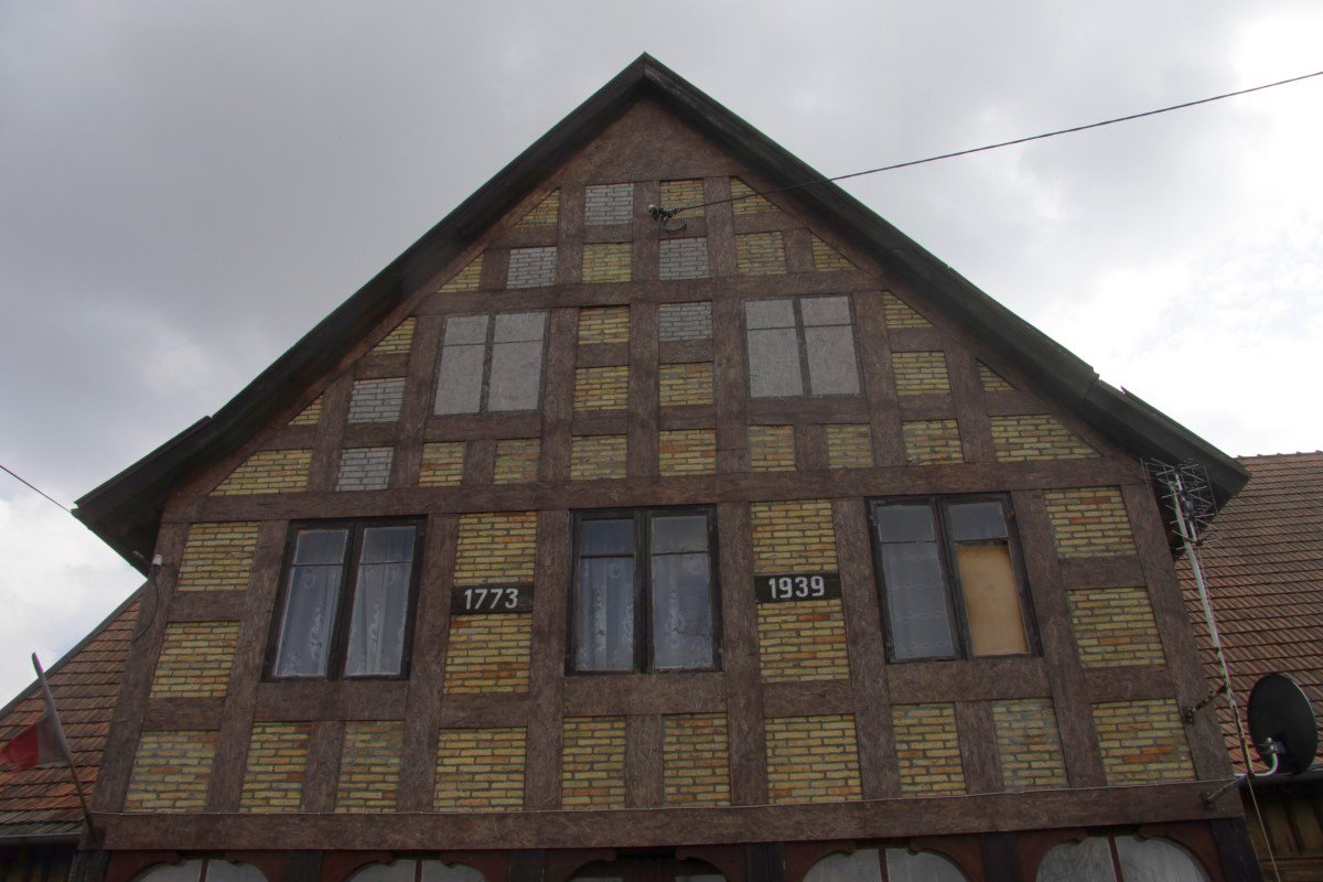 Die heutigen Eigentümer können finanziell bedingt eine fachgerechte Renovierung ebenfalls nicht durchführen. Auf die Vorderseite des Vorbaus wurden als Balkenimitation in Brettform geschnittene OSB-Platten gesetzt und im Dachgeschoss Fenster aufgemalt. Das wirkt auf den ersten Blick auch täuschend echt, aber es bleibt trotzdem zu hoffen, dass eines Tages die Mittel vorhanden sein werden um dieses Haus umfassend renovieren zu können.