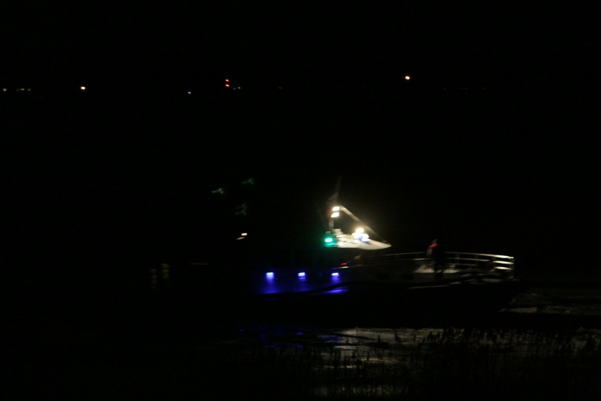 brüllender Motorenlärm ließ mich vorhin aufhorchen. Schon von Weitem war er zu hören, ließ mich rätseln was es sei. Aber es dauerte nicht lange bis ich die richtige Vermutung anstellte: Eisbrecher! Ich glaube, es war November als der letzte hier vorbeifuhr. Und nun ein brüllendes Stampfen, langsam näher kommend. Zwei Eisbrecher, nur im Schritttempo, trotz voller Kraft voraus.